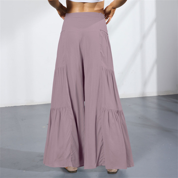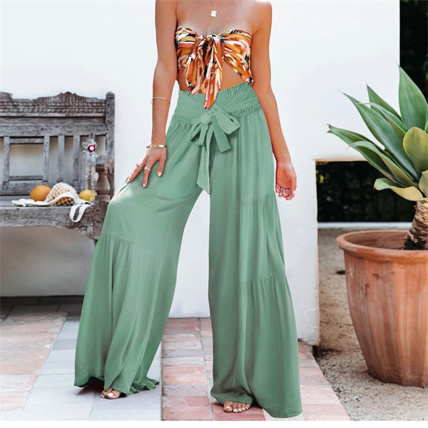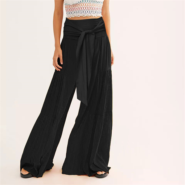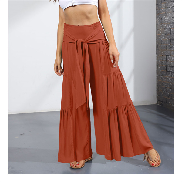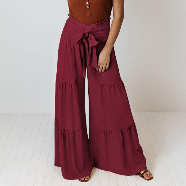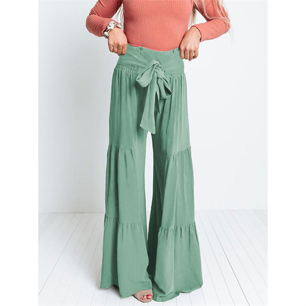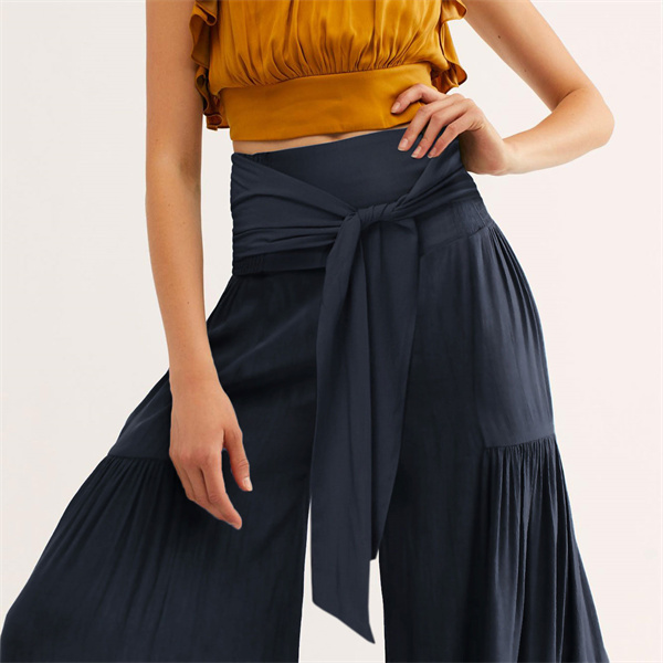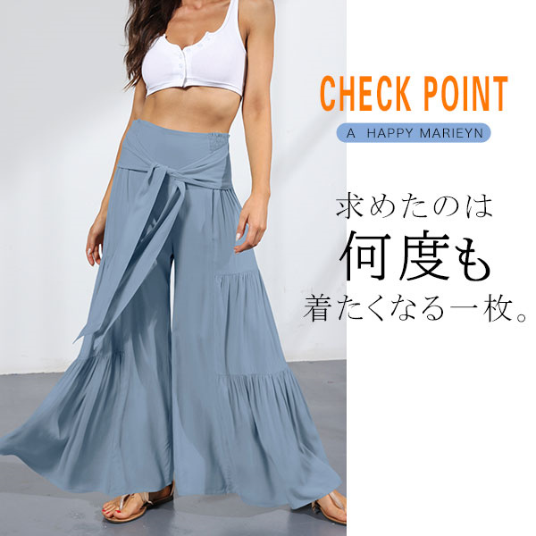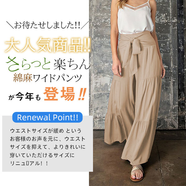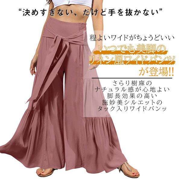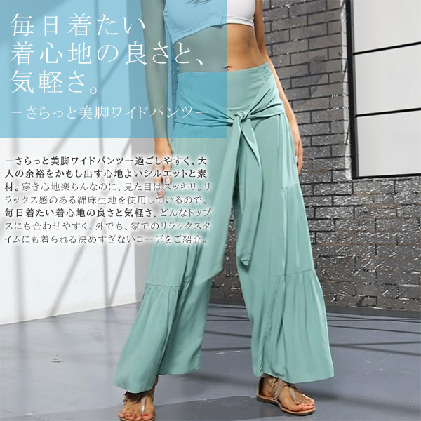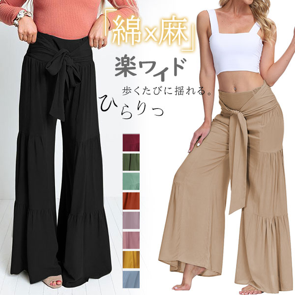 ポイント超超祭 ワイドパンツ 綿麻風 レディース リネン ガウチョパンツ ロングパンツ ボトムス ウエストゴム リボン 無地 体型カバー すっきり 細見え 着痩せ