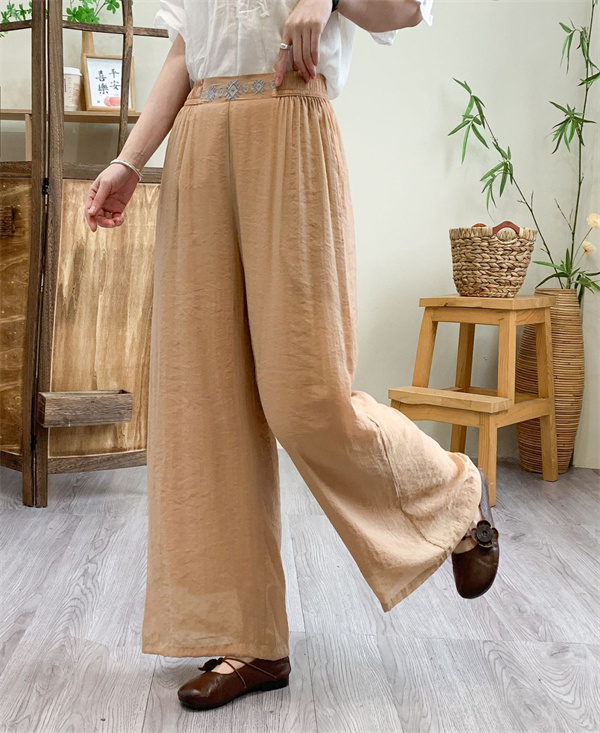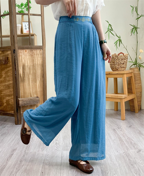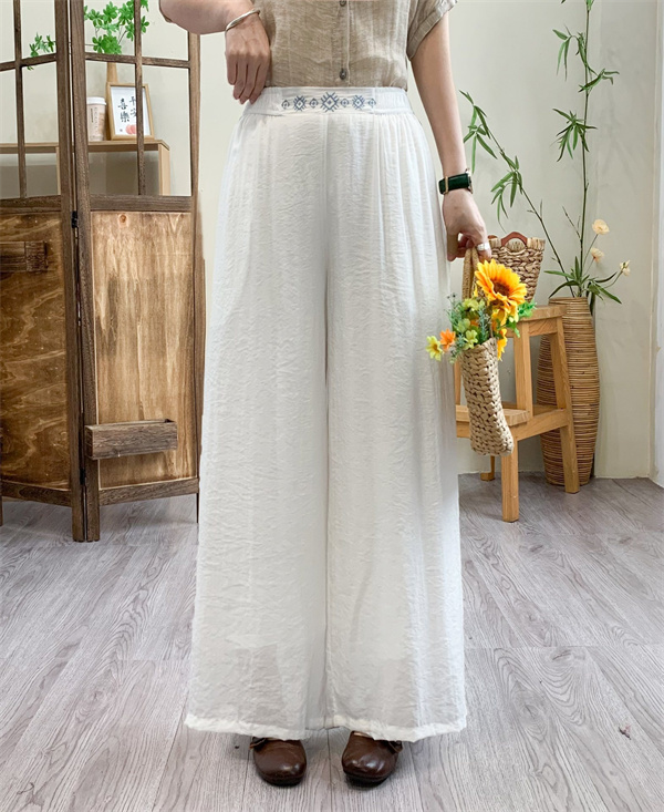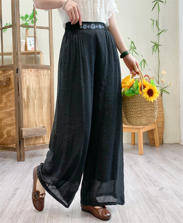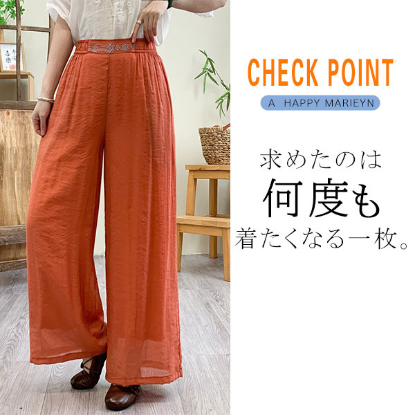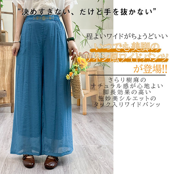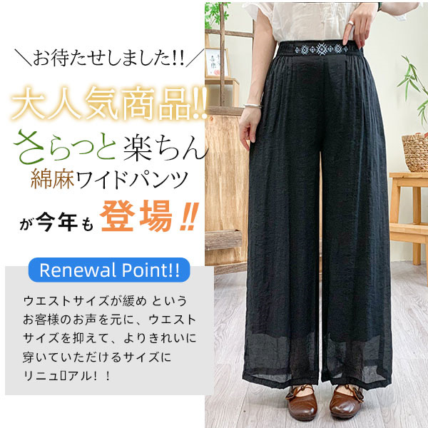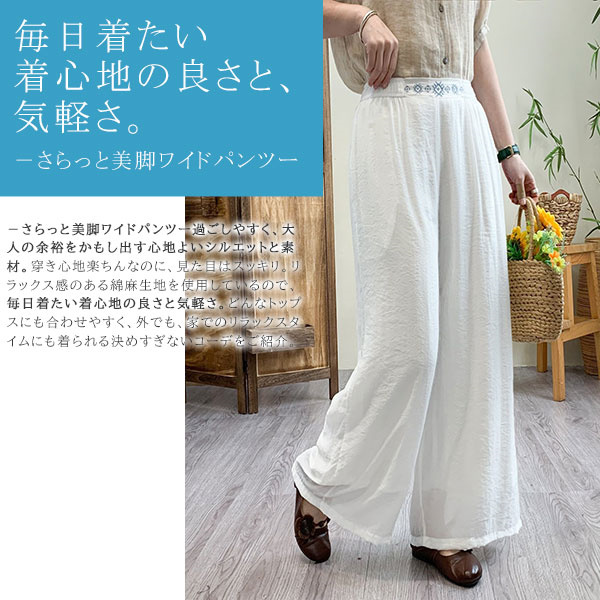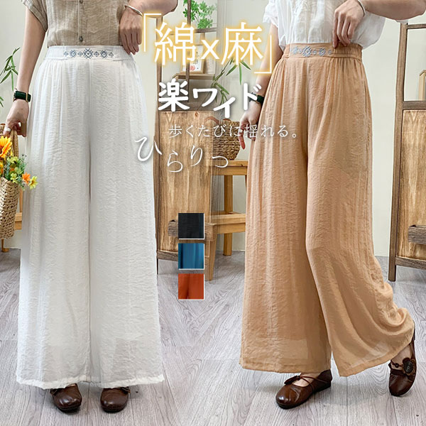ガウチョパンツ レディース リネン 綿麻パンツ 刺繍 ワイドパンツ ガウチョ ロングパンツ 体型カバー 着痩せ 母の日 プレゼント 無地