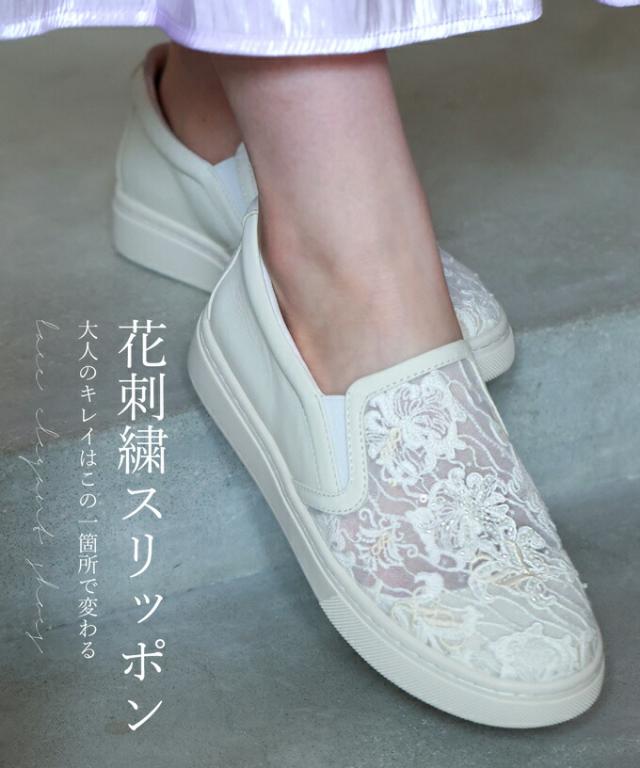 再入荷6月14日 花刺繍スリッポン 大人のキレイはこの一箇所で変わる cawaii w60750ps 35~39対応 春夏 春物 夏物 22.5cm 23.0cm 23.5cm 24.0cm 24.5cm アイボリー 柄 花 靴 シューズ 日常使い おでかけ お洒落 大人可愛い 上品 レディース ファッション ミセス 30代 40代