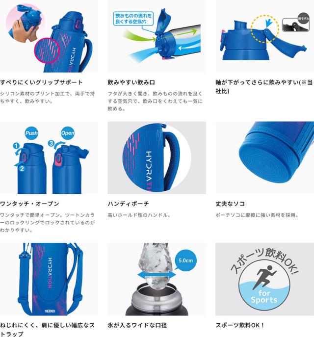 人気のスポーツボトルがリニューアル。両手で握ったときにすべりにくい加工を施したポーチや、大きく開いて飲みやすいキャップユニットなど使いやすさにこだわりました。