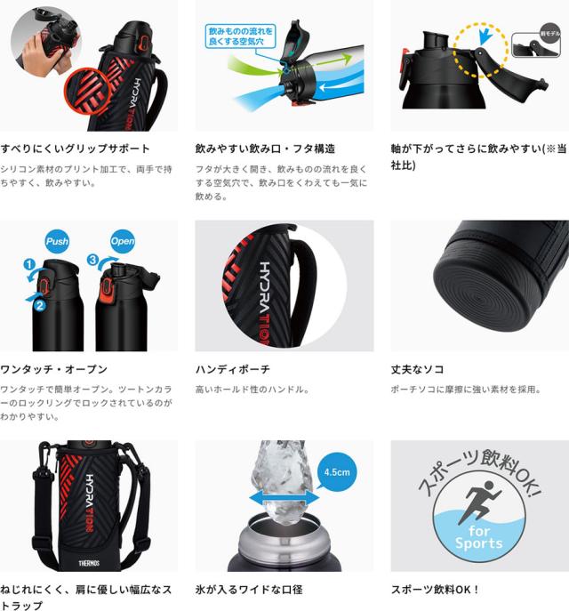 人気のスポーツボトルがリニューアル。両手で握ったときにすべりにくい加工を施したポーチや、大きく開いて飲みやすいキャップユニットなど使いやすさにこだわりました。