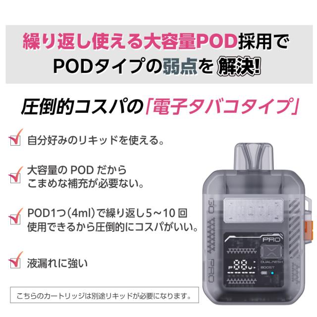 大容量4mlリキッドPODを備えた空カートリッジは頻繁なリキッド補充の煩わしさがなく、フル充填で数日間のベイピングを可能とし、圧倒的なコストパフォーマンスを誇ります。