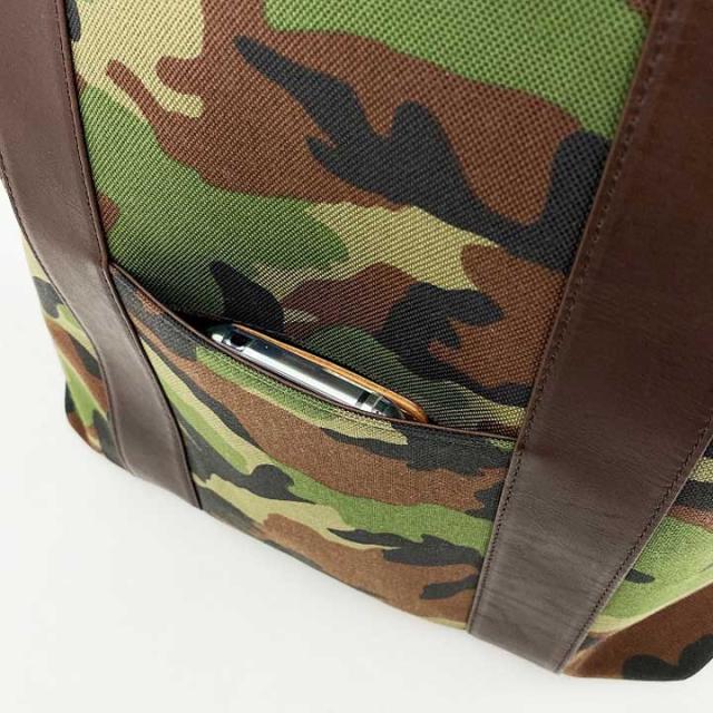 ナイロン生地と牛革のコンビの、カモフラージュ柄トートバッグ。メインの素材に使用しているナイロン生地のコーデュラは、アメリカ・インビタス社の登録商標で、一般的なナイロンの7倍もの強度がある高性能ファブリック。摩耗や引き裂き、擦り切れに対する強度があり、ミリタリーやアウトドアといった過酷な環境下で使われております。また、軽量で堅牢度にも優れており、高性能の撥水、防水機能も持ち合わせております。牛革のオイルダコタはコンビなめしというタンニン:クロムが6:4の比率で配合されているのでとても柔らかい上に、使い込むとツヤが出て、経年変化を楽しめます。カジュアルなコーディネートに合わせやすく、メンズでもレディースでもGood.バッグ前面にはスマホがすっぽり入るサイズのポケット付き。マチが十分にあるので、A4ファイルやノートパソコンを入れても余裕の収納力。荷物が多めの方でも安心です。
