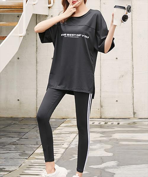テディショップ(TeddyShop)/レディース 半袖英字ロゴヨガトップス+ブラ+レギンスセットアップ 3点セット