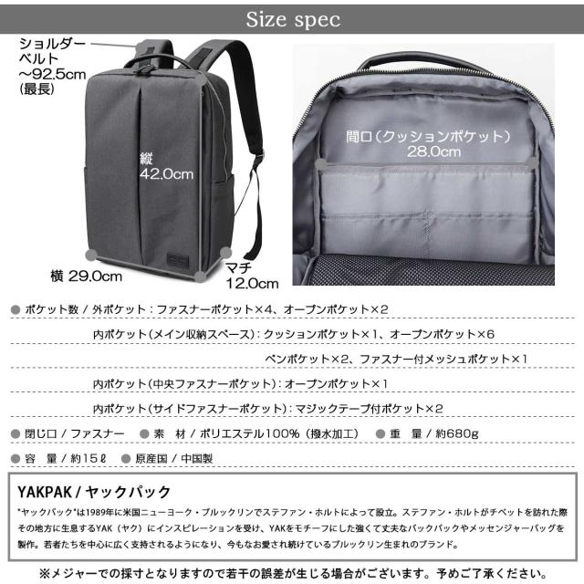 ヤックパック(YAKPAK)/ビジネスリュック 撥水 リュック 大容量