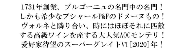 1731年創業、ブルゴーニュの名門中の名門! しかも希少なブシャールP&Fのドメーヌもの! ヴォルネと隣り合い、時にはほぼそれに匹敵 する高級ワインを産する大人気AOCモンテリ! 愛好家待望のスーパーグレイトVT[2020]年!