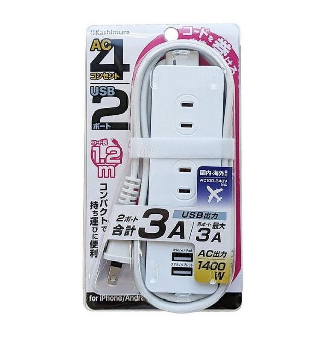 カシムラ 電源タップ ACコンセント4口 合計1400W+USB-A 2ポート 合計3A 1.2m AC-045【送料無料】