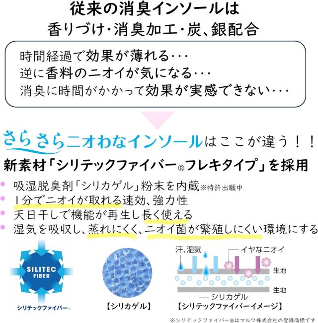 【足臭を未然防止】シリカゲルの吸湿効果でニオイ菌が繁殖しにくい湿度にすることで防臭します。