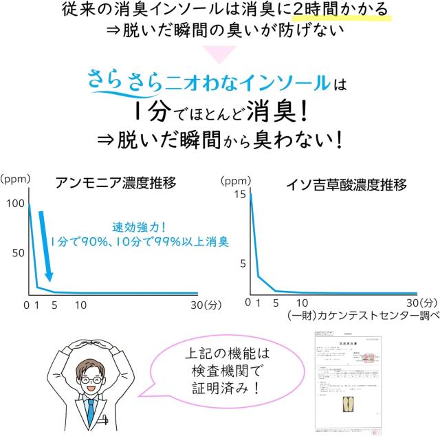 消臭機能:足臭の原因であるアンモニアを1分で95%、10分で99%消臭。イソ吉草酸も97%以上消臭。