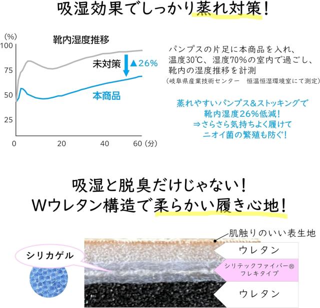 蒸れ防止機能:靴内湿度を未使用時に比べ30%以上ダウン。インソールに内蔵されたシリカゲルが足汗、湿気を吸湿します。