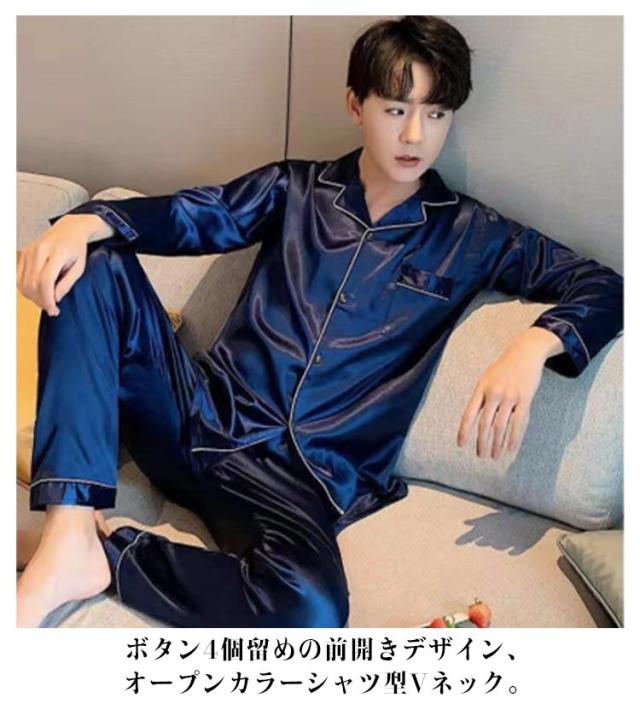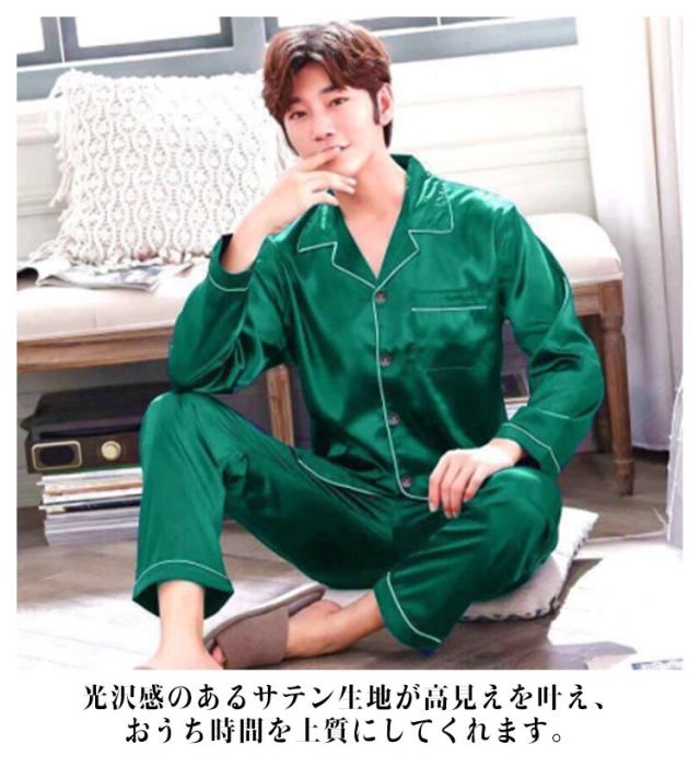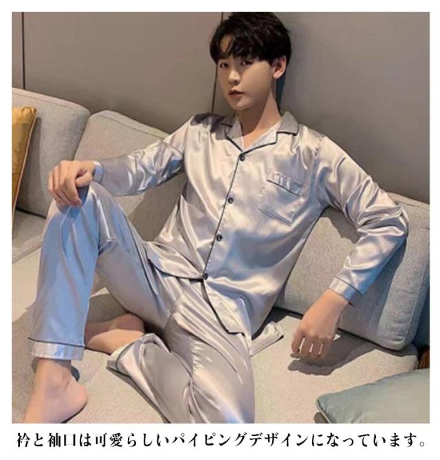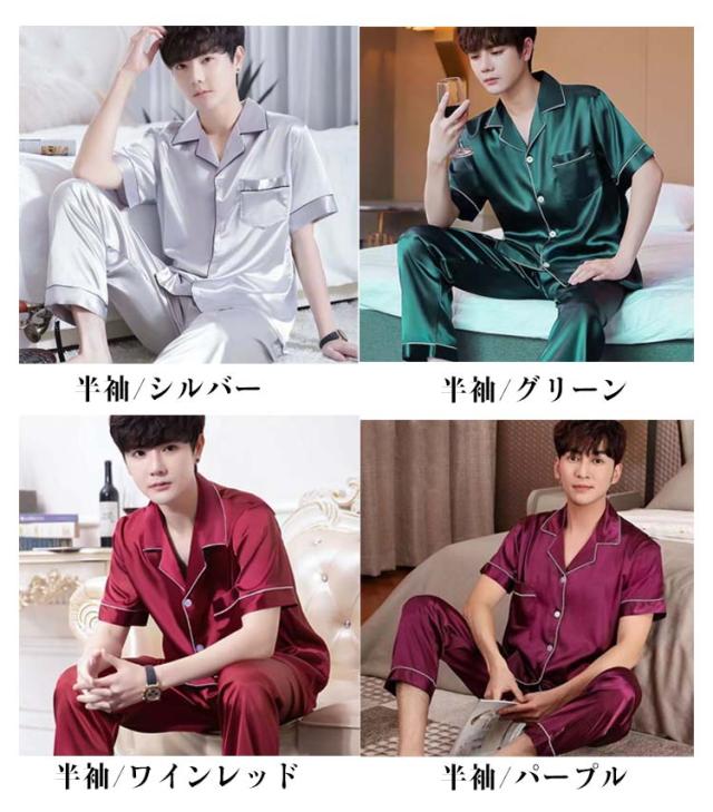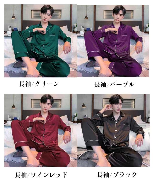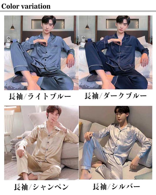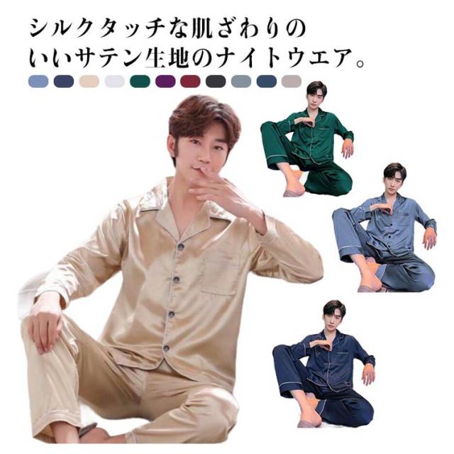 シルクタッチ ルームウェア サテンパジャマ メンズ ルームウェア 上下セット 長袖 半袖 前開き セットアップ 涼しい 光沢 ナイトウェア パジャマ シャツパジャマ 春夏 秋 シャツ ロングパンツ 大きいサイズ 無地 送料無料