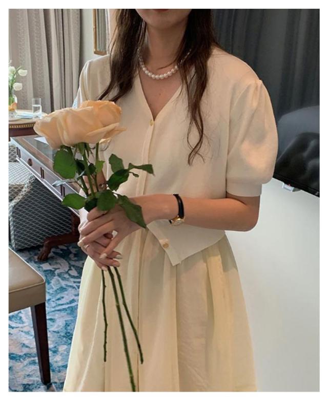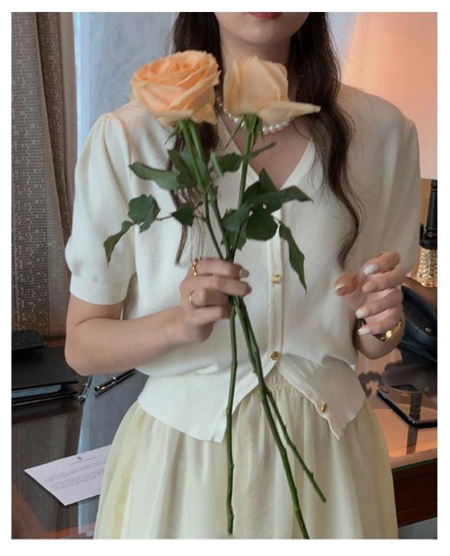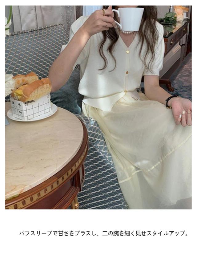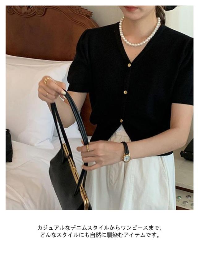 | Vネックデザインが女性らしさを引き立て、スタイリングにアクセントを。韓国人気の前ボタンのサマーニットです。 カジュアルなデニムスタイルからワンピースまで、どんなスタイルにも自然に馴染むアイテムです。 シンプルなデザインだからこそ、ゴールドボタンで華やかな印象をフラス。 パンツもスカートも合わせやすいデザインなのにどこか女性らしい雰囲気なのは、さりげないキーネックがデコルテをきれい見せしてくれるから。 襟元はVネックで首元をすっきりと見せ、女性らしい上品なデザインに。 パフスリーブで甘さをプラスし、二の腕を細く見せスタイルアップ。 | |