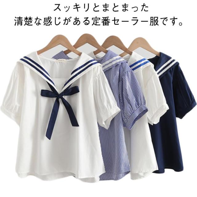 学生 マリン風 半袖 夏物 プルオーバー シャツ レディース セーラー襟 トップス 学園祭 ブラウス セーラーカラー 制服 コットン 森ガール系 ゆったり リボン付き 全4色 可愛い