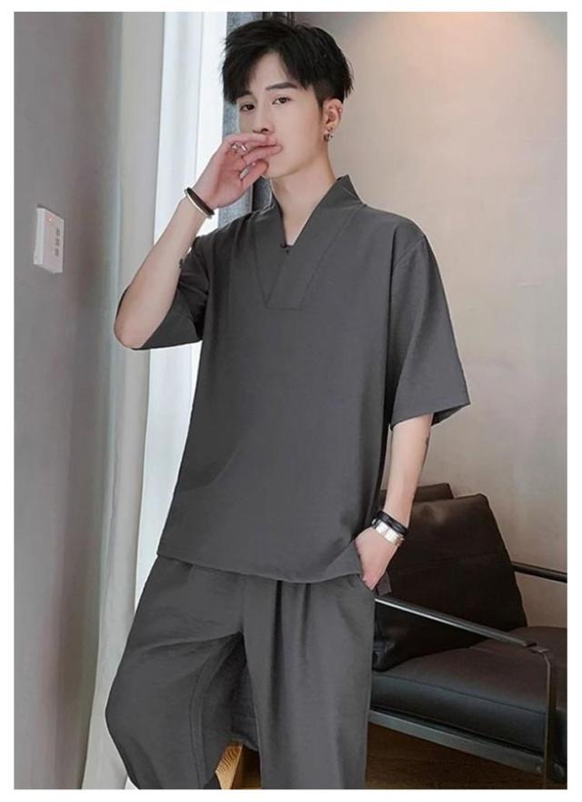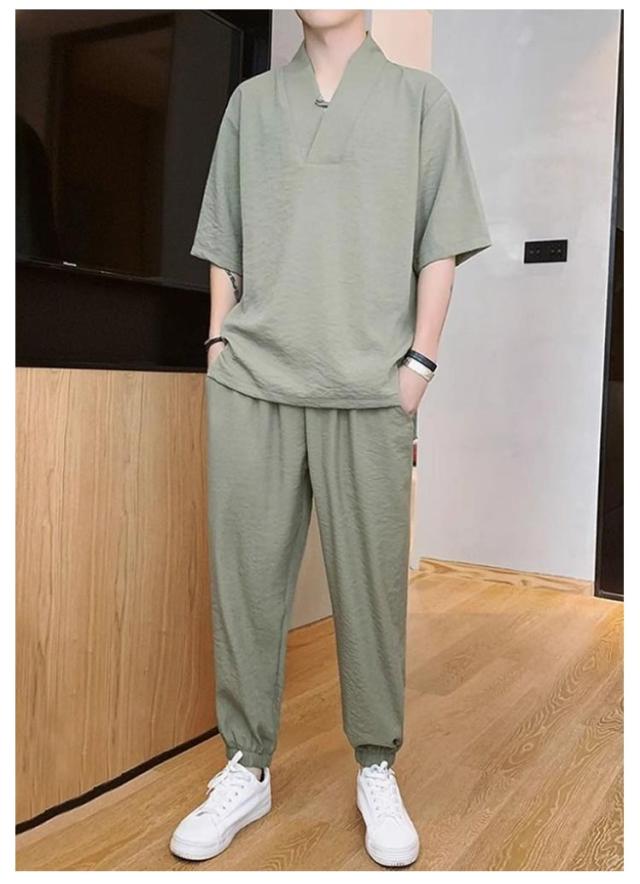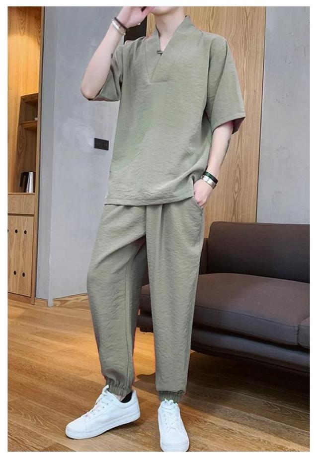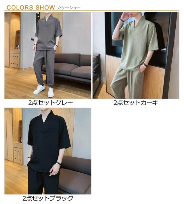 長ズボン 上下セット ウエストゴム 夏 かっこいい 半袖 セットアップ 夏服 2点 上下 スポーツ 綿麻セット 無地 半袖Tシャツ メンズ パンツ ストリート カジュアル トップス 夏物 ルームウェア 人気 韓国 運動着 部屋着 普段着 涼しい スポーツウェア