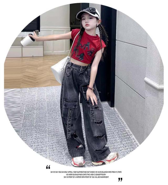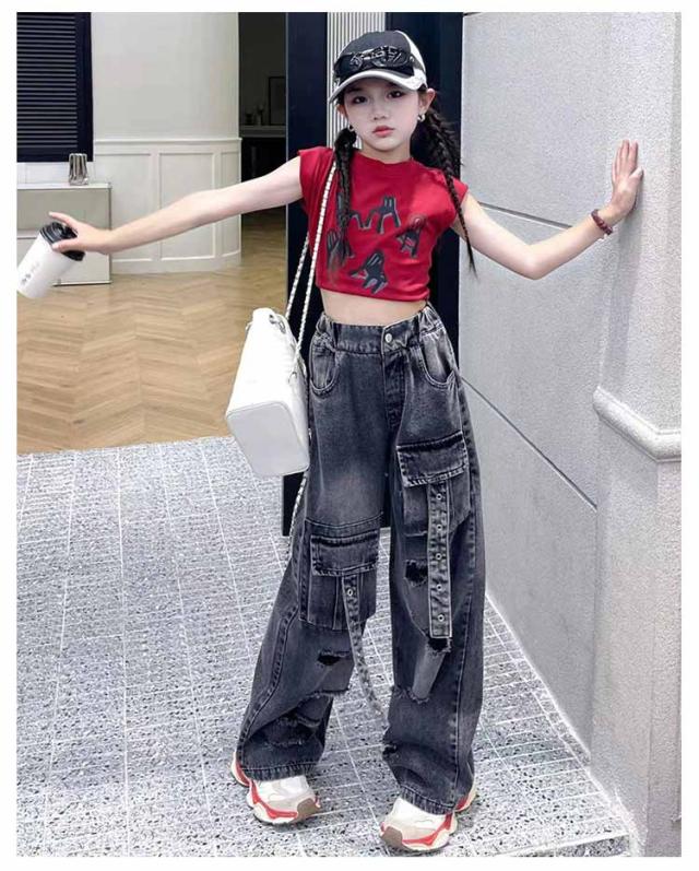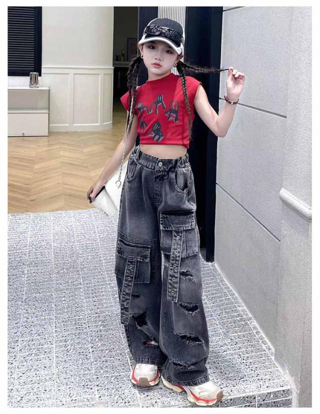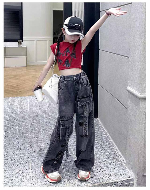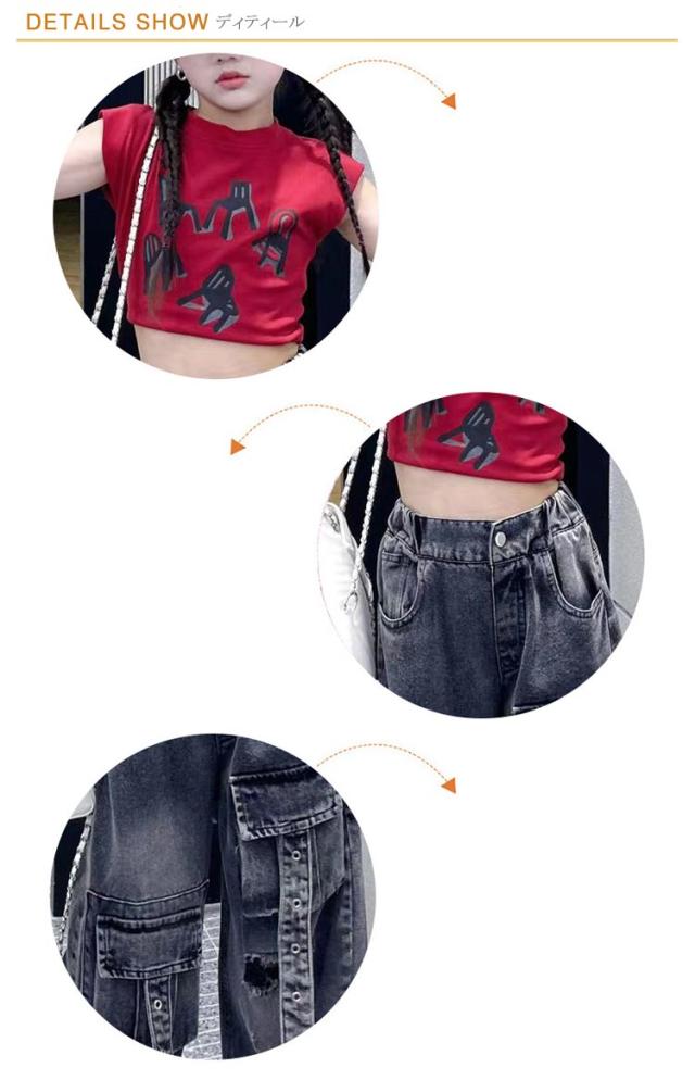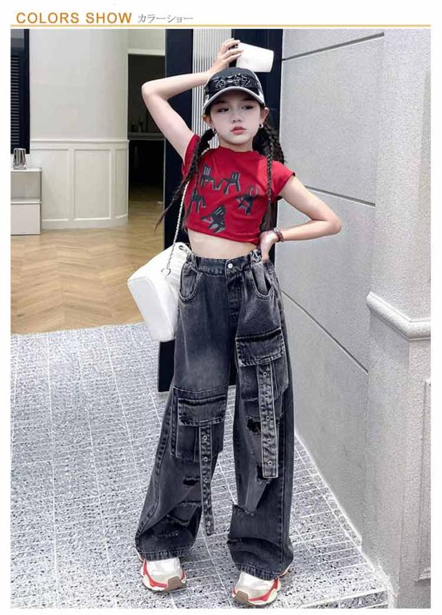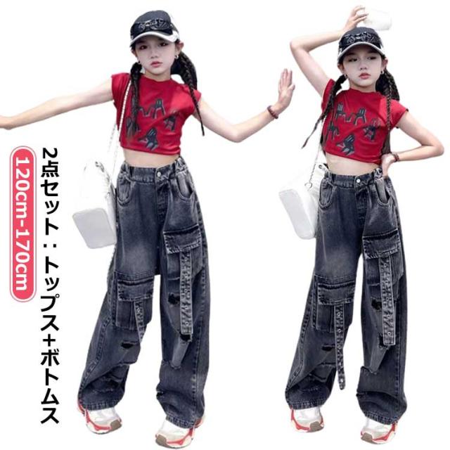 発表会 トップス キッズ ダンス衣装 パンツ 女の子 ワイドパンツ セットアップ tシャツ へそ出し ストレート ゆったり デニム 原宿系 ポッピング ヒップホップ 団体服 ジャズダンス 演出服 応援団 韓国 個性派 チアガール