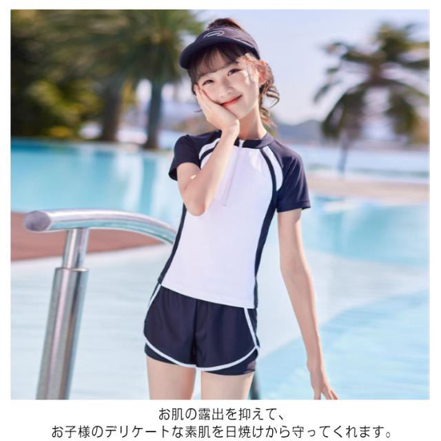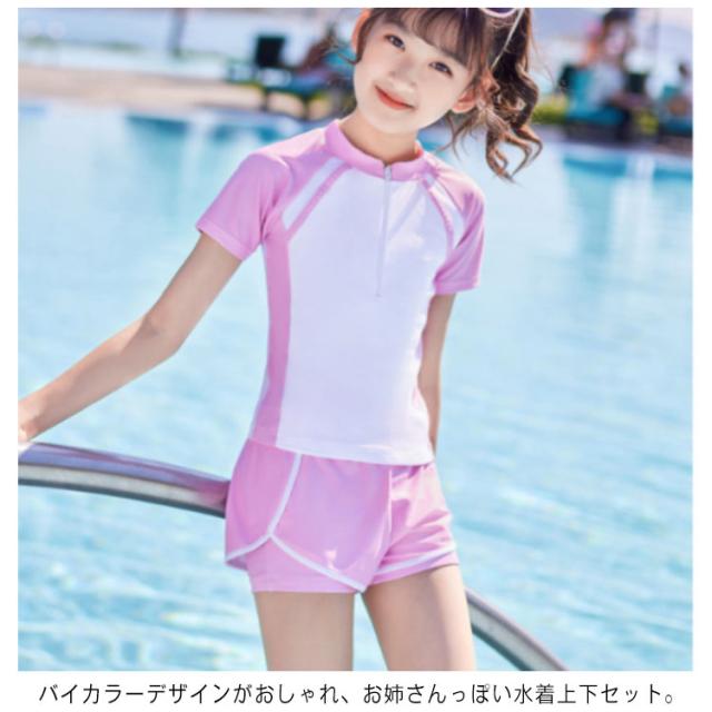 ショートパンツ スクール水着 セパレート ピンク ジュニア スイムウェア フィットネス水着 半袖 スポーツ こども 2点セット キッズ スポーティ プール みずぎ スイミングスクール 重ね着風 小学生 幼稚園 ビーチ 水着