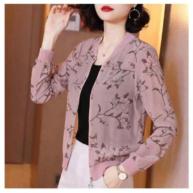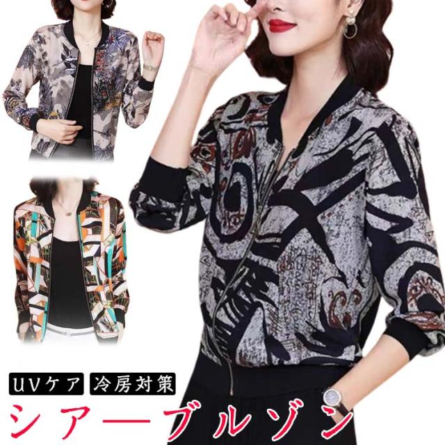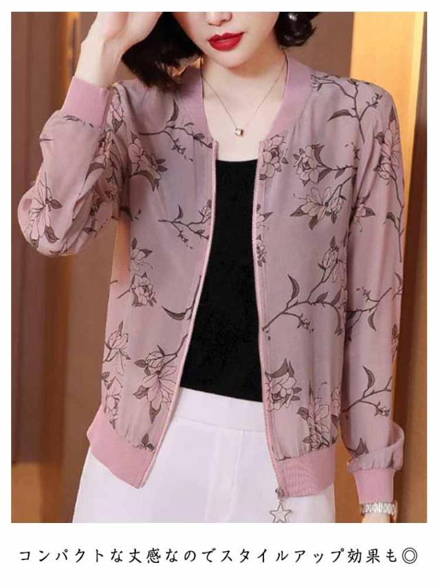 シア—ブルゾン レディース ショート 総柄 羽織り 冷房対策 ノーカラー ジャケット シアー ブルゾン 花柄 長袖 ライトアウター ジッパー 薄手 フェミニン アウター ジップアップ ファスナー 大きいサイズ きれいめ UVケア 透け感