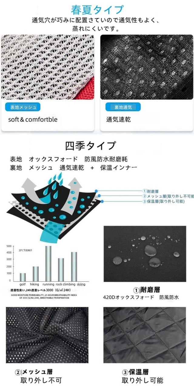 ◆カラー:春夏-メッシュ通気タイプ、秋冬-防風タイプ