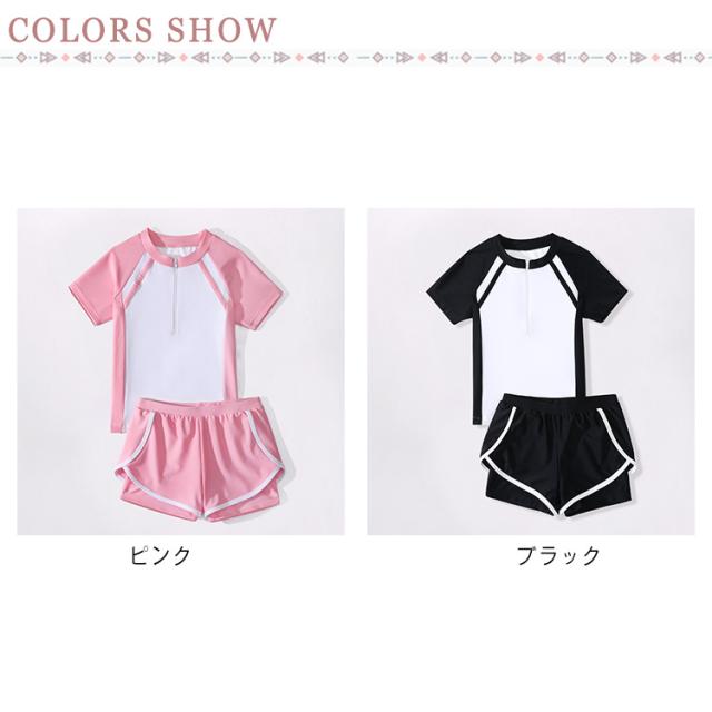 キッズ こども 水着 スイムウェア スクール水着 フィットネス水着 半袖 スポーツ ショートパンツ セパレート 2点セット 重ね着風 ジュニア プール スクール水着 スイミングスクール みずぎ 小学生 幼稚園 ビーチ ピンク ブラック