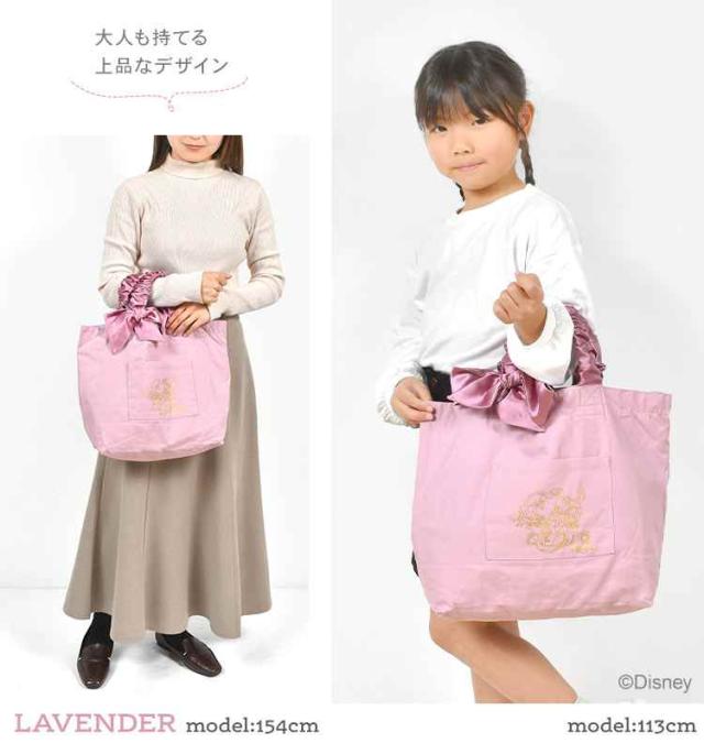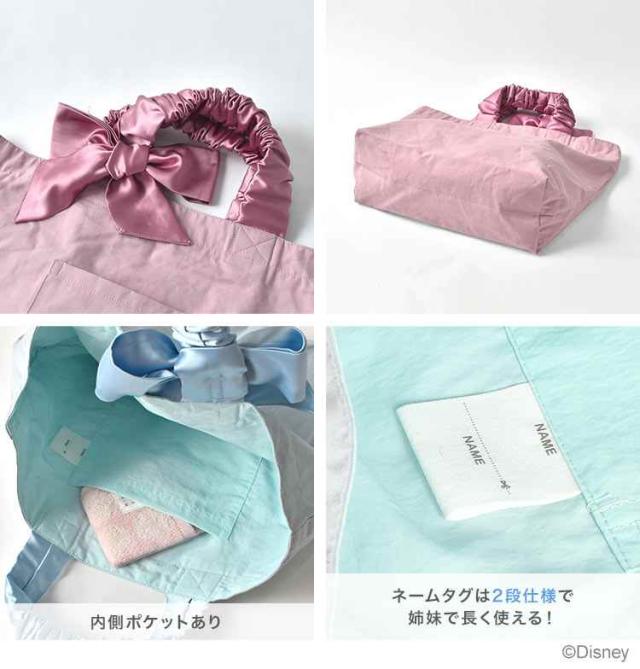 光沢感のあるリボンが可愛いディズニープリンセスのトートバッグ。ラプンツェルとアリエルの上品なイラスト入りで子供から大人まで持てます。ポケットは外と内に一つずつ。ネームタグは名前を書き込む場所が2箇所あり、姉妹で長く使えるのも嬉しいポイント。