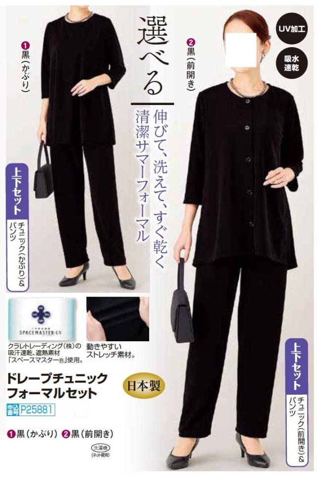 喪服 礼服 日本製 ドレープチュニック フォーマルセット 全2種 ブラックフォーマル セットアップ 上下セット レディース 婦人服 ミセス シニア 女性 ブラウス UV加工 UVカット 吸水速乾 無地 黒 礼装 体型カバー 40代 50代 60代 70代 80代 母の日 お母さん 春夏 fri p25881