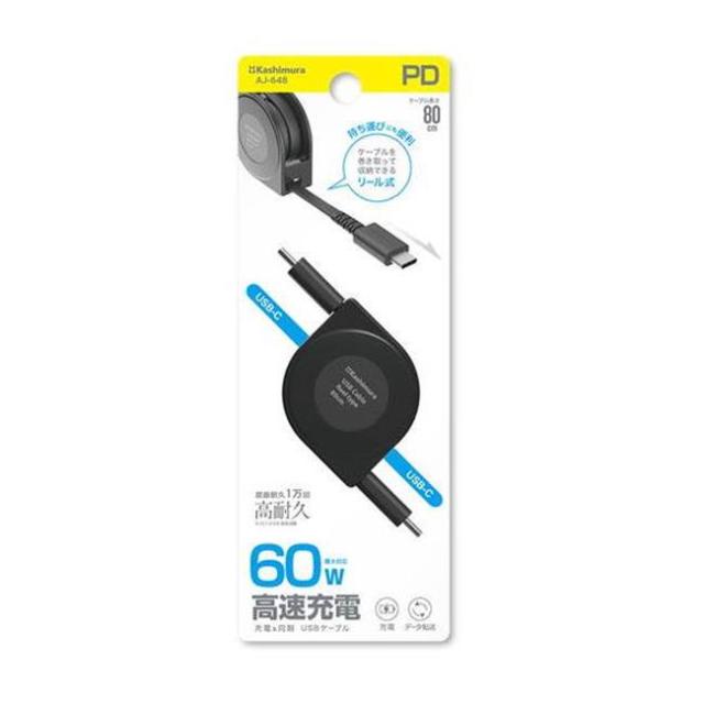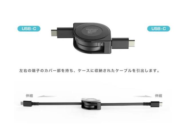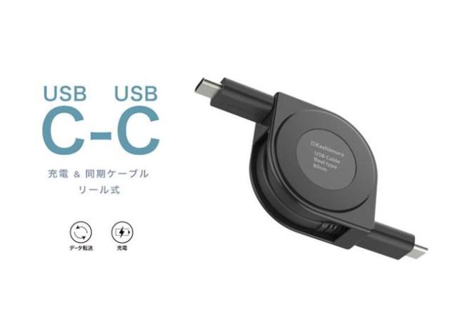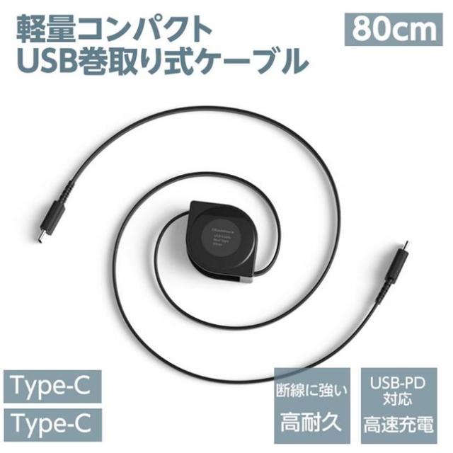 USB充電ケーブル リール 巻取り式 80cm 充電&同期 Type-C to Type-C 高速充電 PD60W対応 断線に強い 高耐久【メール便 送料無料】