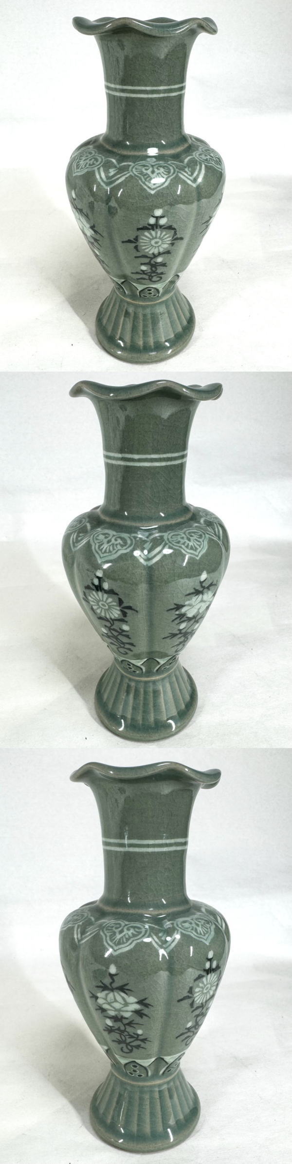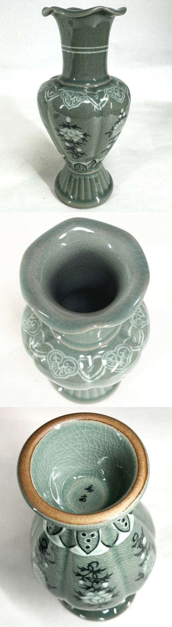 高麗王朝時代から作られてきた代表的な形状の花瓶。安定感のある下部と、牡丹と菊花の象嵌が映える嗣、花びらのような繊細な彫刻が施された 口とが、絶妙な調和で美しい瓜形を形成している味わい深い逸品です。 | ||||||