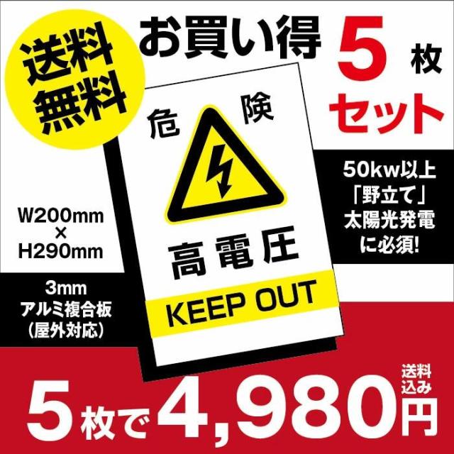 5枚セット 高電圧危険 KEEPOUT W20×H29cm 太陽光発電の注意喚起に 送料無料 屋外対応 防水 アルミ複合板 3mm厚「四隅穴あけ加工 両面テープ加工無料」標識 看板 high-voltage-5set