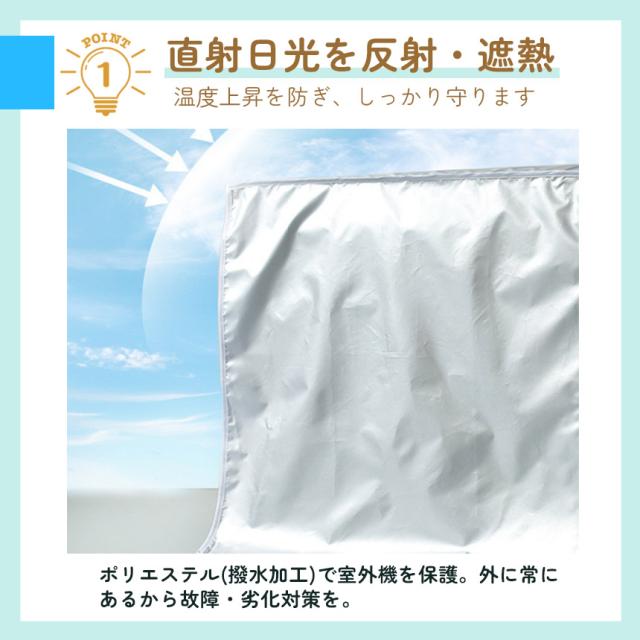 【エアコン室外機を守る】エアコンの室外機、放置していませんか?意外と雨やホコリ、太陽の熱などでダメージを受けて故障も多いんです。せめて使わない時期はエアコンカバーをして保護をしてあげましょう。このエアコンカバーは太陽光・雨・風・雪からエアコン室外機を守ります。降り積もる雪からも守ります。強い風や雨の多い季節、日差しが眩しい季節、雪降る季節、一年通して室外機を守ります。【雨よけ】梅雨の季節には湿度が高まり、エアコンの室外機に損害が発生します。エアコン室外機カバーは雨よけの機能を持ち、エアコンをほとんどん使わない梅雨の季節において、エアコンの室外機を保護し劣化を防ぐことが出来ます。