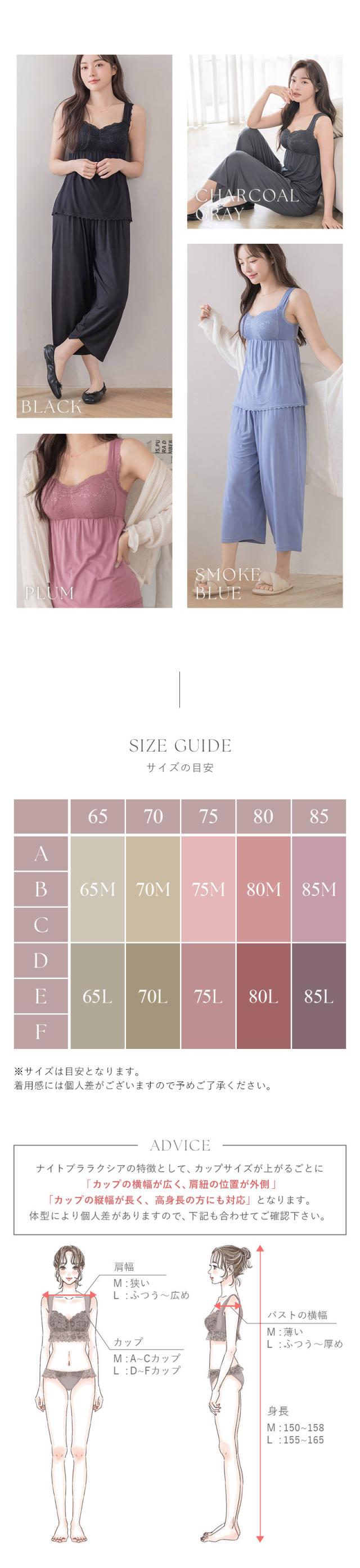 《ナイトブラキャミ》 【65M】アンダー:28cm、裾幅:54cm、総丈:55cm 【65L】アンダー:28cm、裾幅:54cm、総丈:55cm 【70M】アンダー:30cm、裾幅:55cm、総丈:56cm 【70L】アンダー:30cm、裾幅:55cm、総丈:56cm 【75M】アンダー:32cm、裾幅:56cm、総丈:57cm 【75L】アンダー:32cm、裾幅:56cm、総丈:57cm 【80M】アンダー:34cm、裾幅:58cm、総丈:58cm 【80L】アンダー:34cm、裾幅:58cm、総丈:58cm 【85M】アンダー:36cm、裾幅:58cm、総丈:59cm 【85L】アンダー:36cm、裾幅:58cm、総丈:59cm 《クロップドパンツ》 【M】ウエスト:32cm、総丈:81cm、股下:52cm、裾幅:25cm 【L】ウエスト:34cm、総丈:83cm、股下:53.4cm、裾幅:25.5cm 【LL】ウエスト:36cm、総丈:85cm、股下:54.8cm、裾幅:26cm ※スタッフが平置きで採寸した実寸値となりますので、多少の誤差が生じる場合がございます。 |