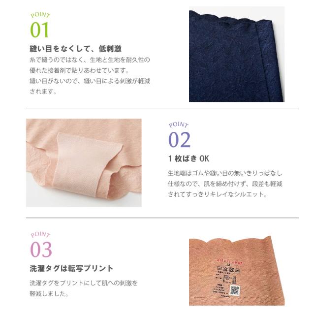 | 特徴 | KIREILABO(キレイラボ) ガードルファンデ ショートソフトガードル おなか、ヒップライン、すっきり! 【ガードルファンデ】 柔らかくて低刺激の完全無縫製タイプのソフトガードル。 ヒップまわりを締め付けず、ボディラインをやさしく補整。 アウターへの響きを気にすることなく、おなかとヒップラインをしっかりカバーします。 <おすすめポイント> ・完全無縫製 縫い目や洗濯タグを無くし、肌への刺激を軽減しました。 足ぐりや腰のゴムよる刺激、締め付けにお悩みの方におすすめです。 ・カットオフレース 生地端にゴムが無いカットオフのストレッチレースを使用しています。 肌あたりが柔らかな素材なので、レース特有の凹凸を感じにくく、フラットな着用感です。 ストレッチレースのほどよいパワーがカラダにフィットしますが、 肌への圧迫感は少なく、おなかとヒップまわりを優しく補整します。 ヒップ下に段差ができにくいので、痩せ見え効果も。 カラダのラインをひろうボトムを着用する時にもおすすめです。 ・1枚ばきOK マチが付いているので、1枚ではくことができます。 ・ボタニカル成分配合 ローズヒップオイル加工付きです。 足ぐり:ローレッグ 丈:深め マチ:あり 1枚ばき:可 ※一枚履きをされた後の返品交換は、 |