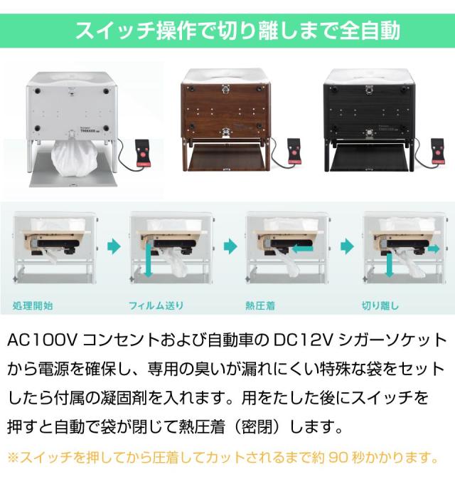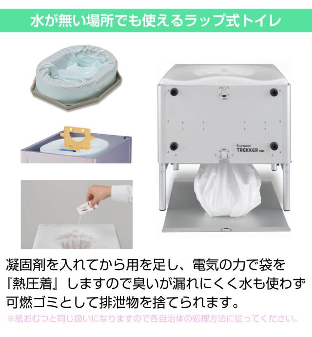 多くの災害現場での経験と、発売から10年以上のノウハウで災害用トイレが最高の一台へ。 省スペースで持ち運び簡単。トランク型ラップポン。 <ラップポンだからできる安心の10機能> -point1- 臭いや菌を漏らさない防臭フィルム 特殊な防臭フィルムBOSと熱圧着により臭いや菌を外に漏らしません。 -point2- お知らせ音付き 電源投入、処理終了、エラー発生時に音でお知らせします。 -point3- 緊急時対応可能なオプション品 停電などで電源が確保できない場合にも対応できるハンディバッテリー、車用DCケーブルなどの各種オプション品を取り揃えています。 -point4- 特殊フィルムと凝固剤の信頼の試験データ ラップ済み袋をそれぞれの条件で試験を行い、臭気漏れ・細菌の遮断効果を確認しています。 -point5- 処理時間の目安を表示 リモコンに処理終了までのカウントダウン表示が付き、圧着完了までの目安がわかりやすくなりました。 -point6- 更にコンパクトで持ち運びも簡単に 本体は傷がついてもサビにくくお手入れがしやすいアルミニウム合金製。軽量で持ち運びも収納も簡単。 -point7- 省電力モード/電源OFF機能 使用後1分で省エネモードになり、60分以上使用しない場合は電源が自動的にOFFになる待機モードを搭載。 -point8- 収納ポケット搭載 両脇に収納ポケットが搭載され、バッテリーなどを収納することも可能になりました。 -point9- 工具不要の簡単組み立て 組み立てには工具を使わず、2箇所のネジを留めるだけ。 -point10- 安全機能付きの安心設計 フィルムが閉じる時に異物や人の手などが挟み込まれるのを感知すると動作を中断する「挟み込み防止機能」を搭載。 |