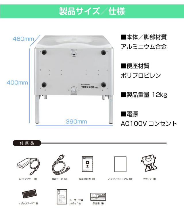 材質: 脚/ アルミニウム合金 便座/ ポリプロピレン 製品重量: 本体/ 約12kg ACアダプター/ 約600g 入力電源: AC100V、50・60Hz (ACアダプター)又は DC14.8V(専用バッテリー※別売)又は DC12V(車用DCケーブル※別売) ※電源選択スイッチにより切替 消費電力: 75W(バッテリー駆動可※別売) 耐荷重: 100kg 製品寸法: 使用時/ 幅390mm×奥行き460mm×高さ400mm 収納時/ 幅390mm×奥行き460mm×高さ270mm |