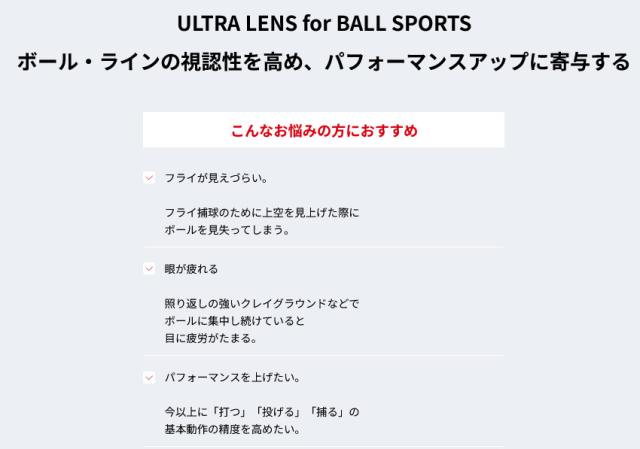 ボールやラインの一瞬の認識スピードがパフォーマンスを左右する野球・テニス等のボールスポーツ競技用レンズ。