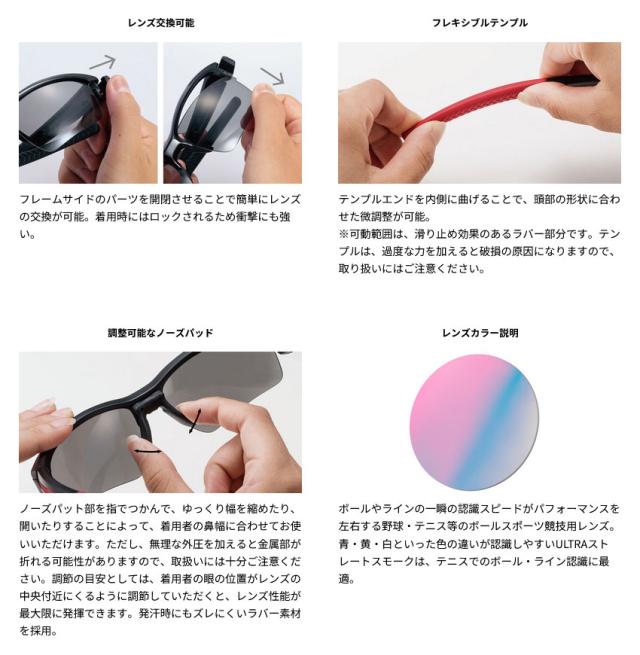| フレーム機能 | レンズ交換可能、テンプル調整可能、ノーズ調節可能 |