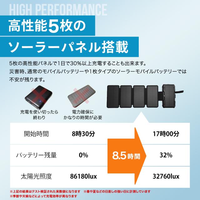 5枚の高性能ソーラーパネル:太陽光で効率的に充電が可能ですので、災害などの緊急時に役立ちます。