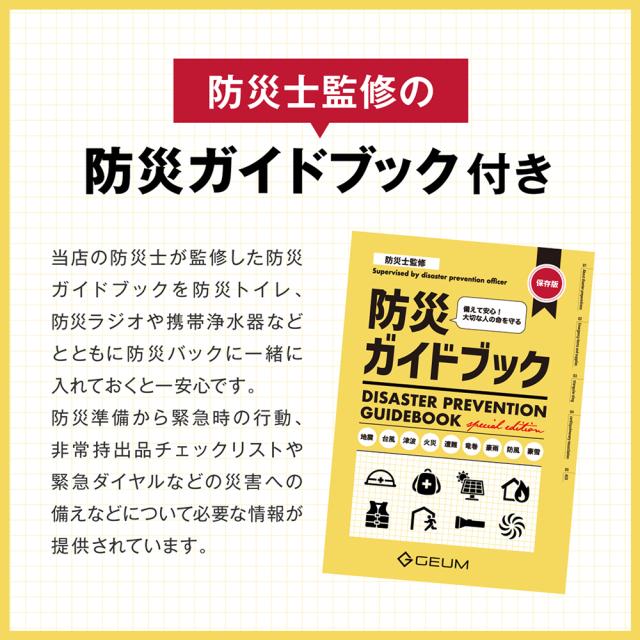 安全保護システムを搭載しているため長期間安心してお使いいただけます。 【防災士監修】 当店の防災士が監修した防災ガイドブックを防災トイレ、防災ラジオや携帯浄水器などとともに防災バックに一緒に入れておくと一安心です。防災準備から緊急時の行動、非常持出品チェックリストや緊急ダイヤルなどの災害への備えなどについて必要な情報が提供されています。