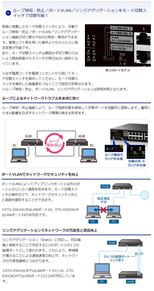 ETGESH16LM 16ポート。ループ検知・防止やポートVLANに対応。モード切替スイッチで機能切り替えが可能なL2スイッチングハブ