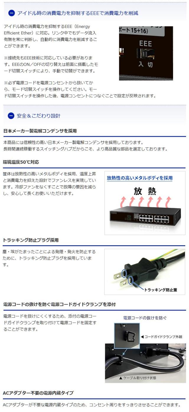 | Ethernet規格 | 10BASE-T(IEEE802.3i)、10BASE-Te(IEEE802.3az)、100BASE-TX(IEEE802.3u)、1000BASE-T(IEEE802.3ab)※全ポート「Auto MDI/MDI-X」「オートネゴシエーション」対応 |
