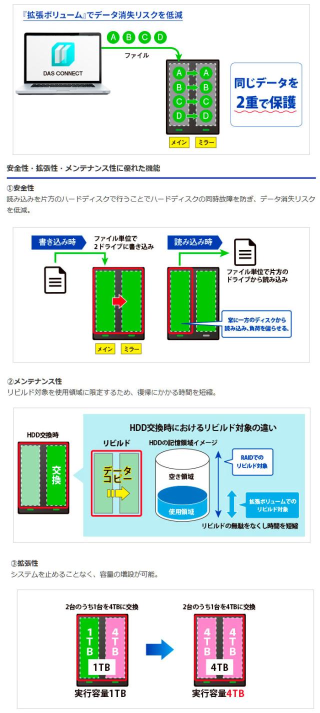 また、データの消失リスクを低減する『RAID 1(ミラーリングモード)』、独自の冗長性技術『拡張ボリューム』に対応し、安心したデータ運用を実現します。