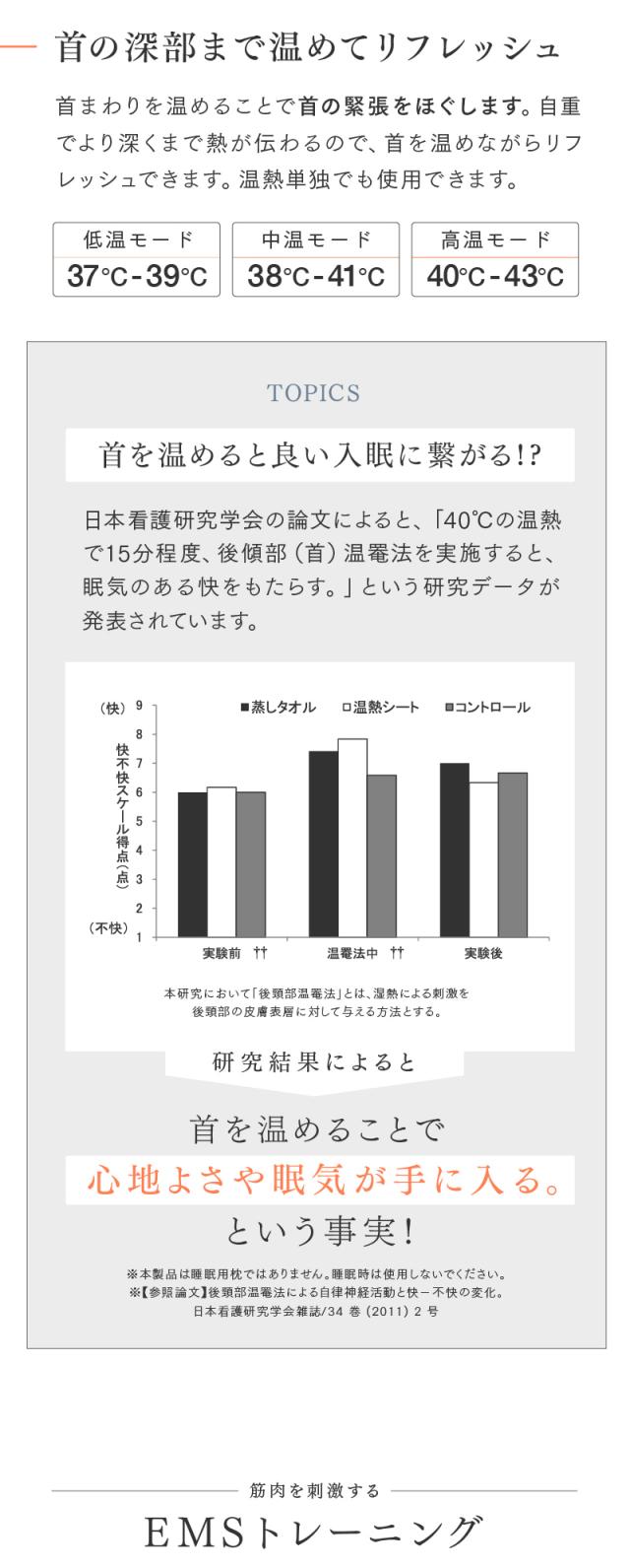 "温熱"で首まわりの緊張をほぐしリフレッシュできます。