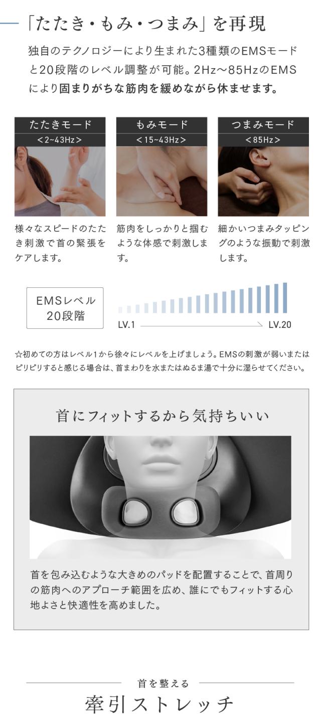 独自のテクノロジーにより生まれた3種類のEMSモードと20段階のレベル調整が可能。2Hz〜85HzのEMSにより固まりがちな筋肉を緩めながら休ませます。