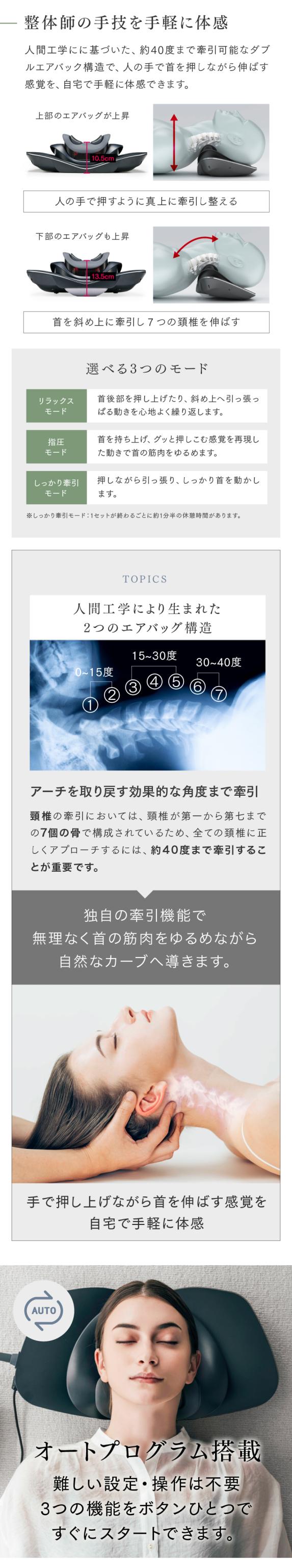 人間工学にに基づいた、約40度まで牽引可能なダブルエアバック構造で、人の手で首を押しながら伸ばす感覚を、自宅で手軽に体感できます。