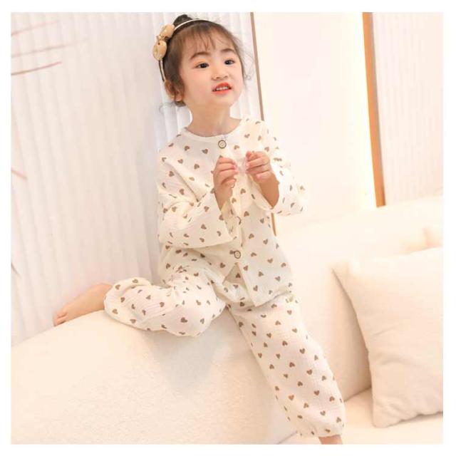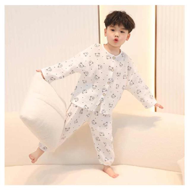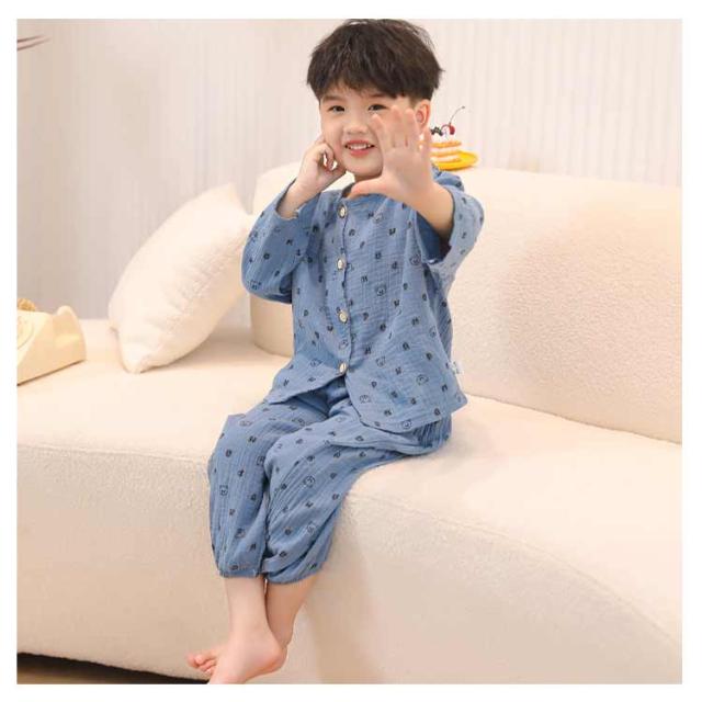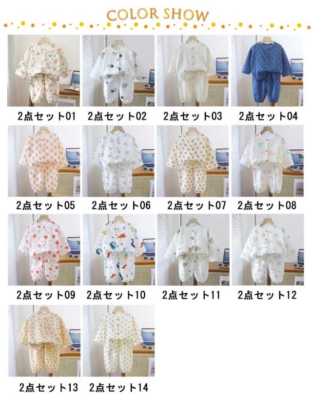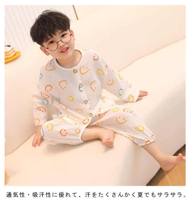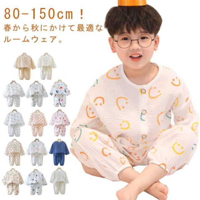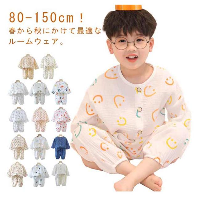 送料無料 キッズ パジャマ ガーゼ コットン 長袖 前開き 長ズボン 上下セット 2点セット 子ども ルームウェア ベビー 子供服 男の子 女の子 部屋着 ゆったり ロングパンツ 吸水速乾 通気性 総柄 かわいい 春 夏 秋 恐竜 80 90 100 110 120 130 140 150cm