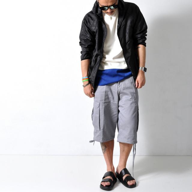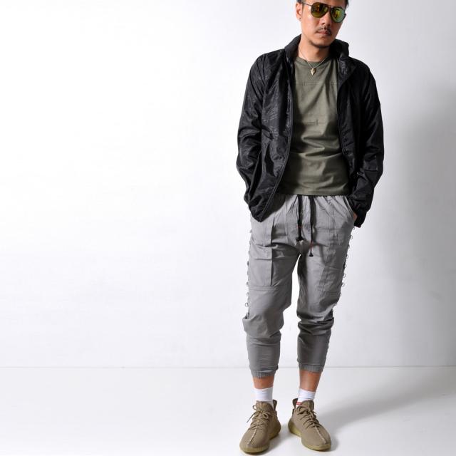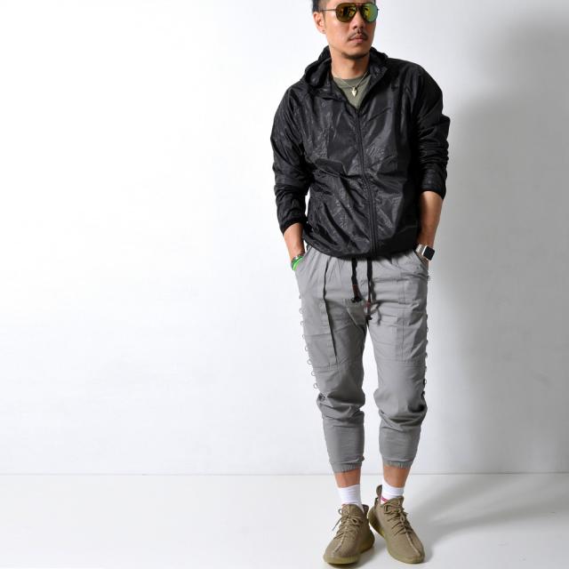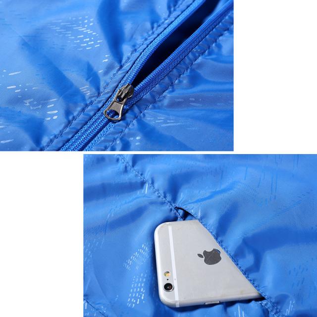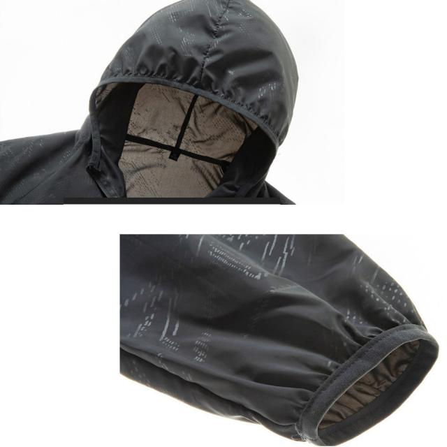 細かいプリント柄がリフレクターになっているナイロン系の薄手パーカー撥水性・防風性があり、突然の雨や寒さにも対応可能◎