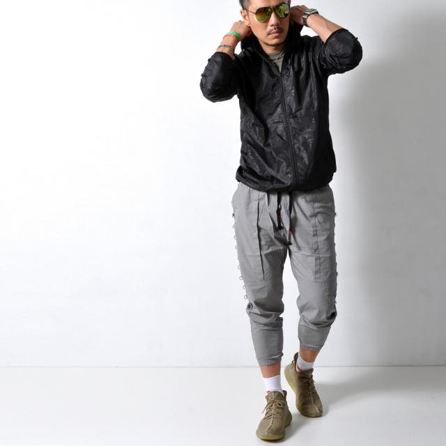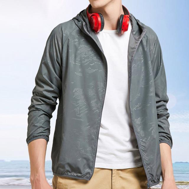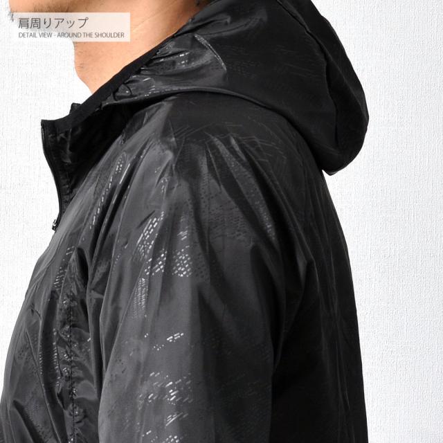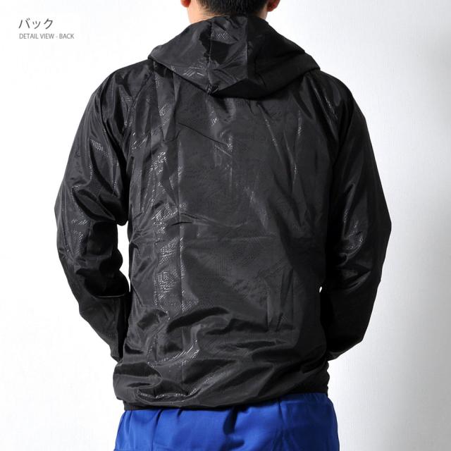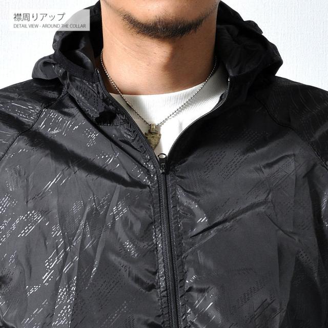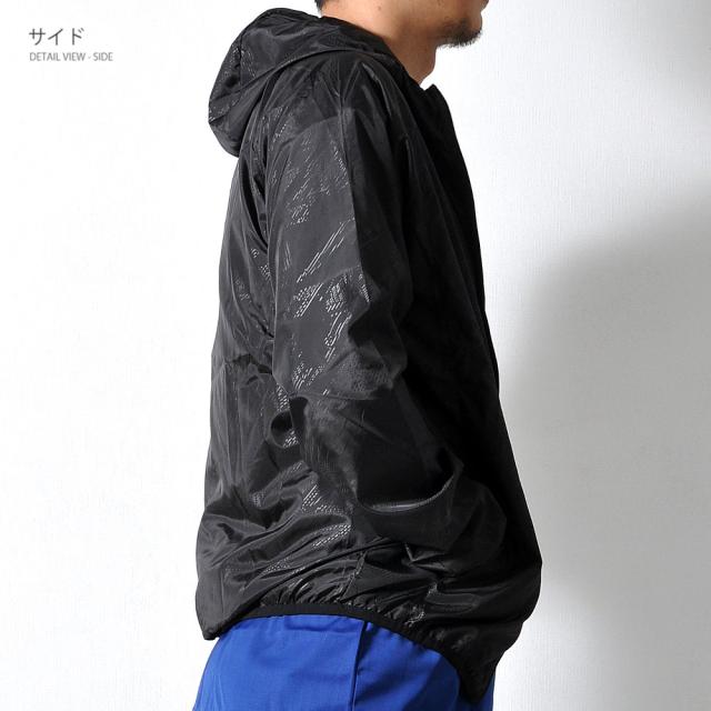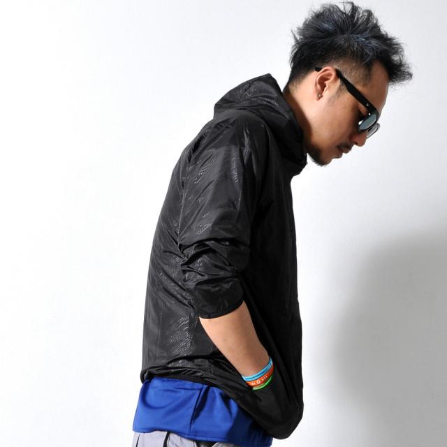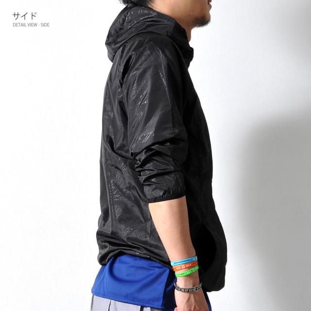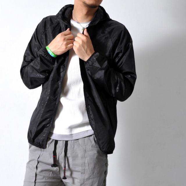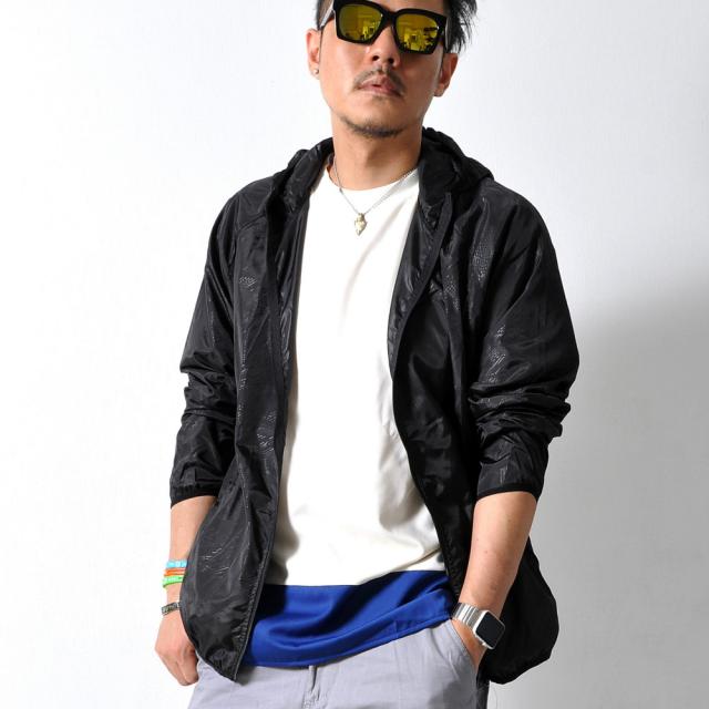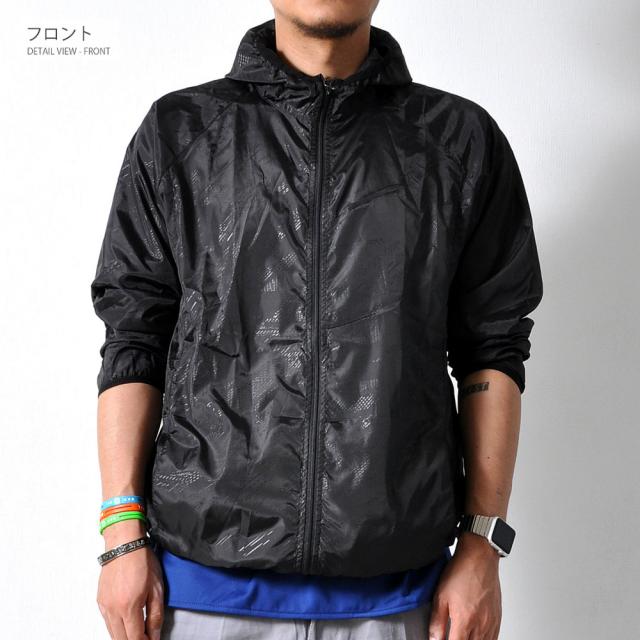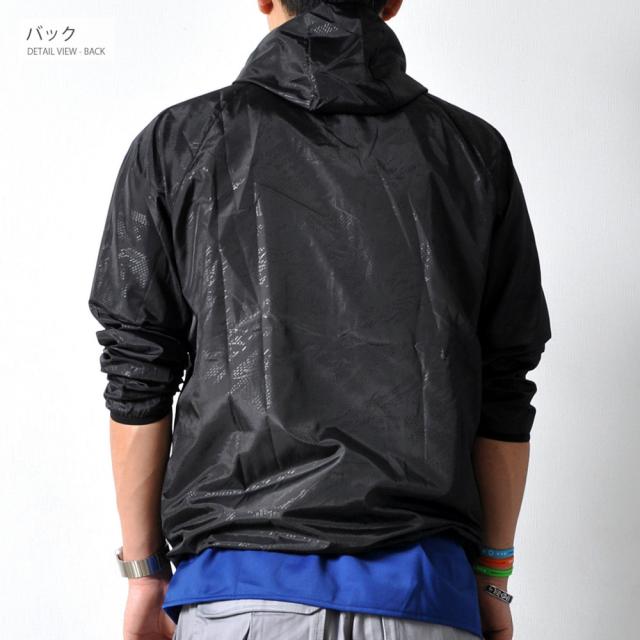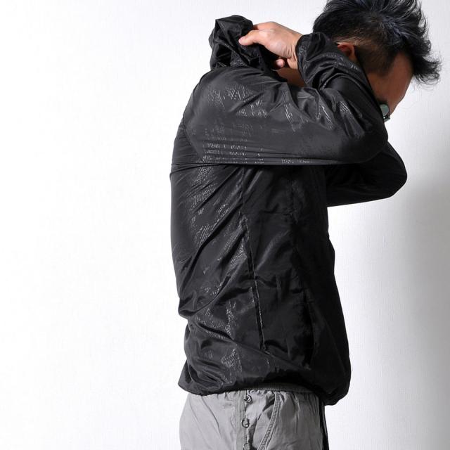 細かいプリント柄がリフレクターになっているナイロン系の薄手パーカー