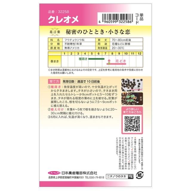 クレオメはアザミウマやコナジラミなどを食べてくれるタバコカスミカメと呼ばれる益虫を呼び寄せる効果があります。タバコカスミカメは特定農薬(生物農薬)にも指定されていて、トマトやピーマンやナスなどのナス科の植物にに発生しやすいコナジラミやアザミウマを防止するための対策として、クレオメを近くで育てる農家さんも多いです。ただ、コナジラミなどの餌が少ないときはタバコカスミカメがトマトなどを食害することがあります。
