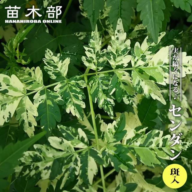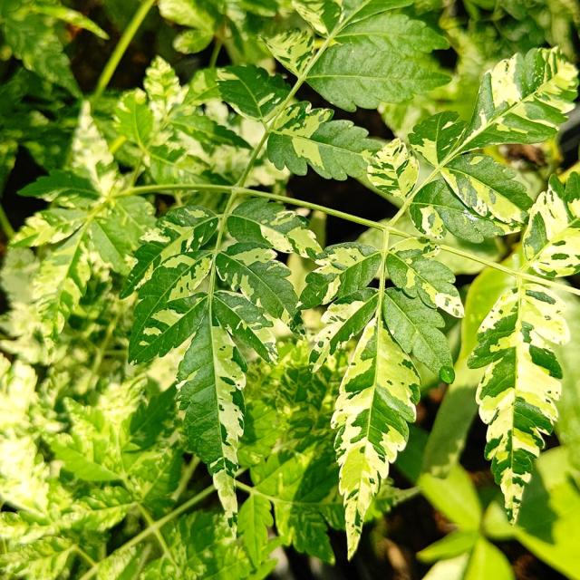 センダン 佐野錦は以前は「斑入」の名前で販売しておりました。2025年9月から佐野錦の名前で販売します。葉に美しい三光斑、白散掃込斑が入る珍しい美葉品種です。実は可愛らしい縞々になります。