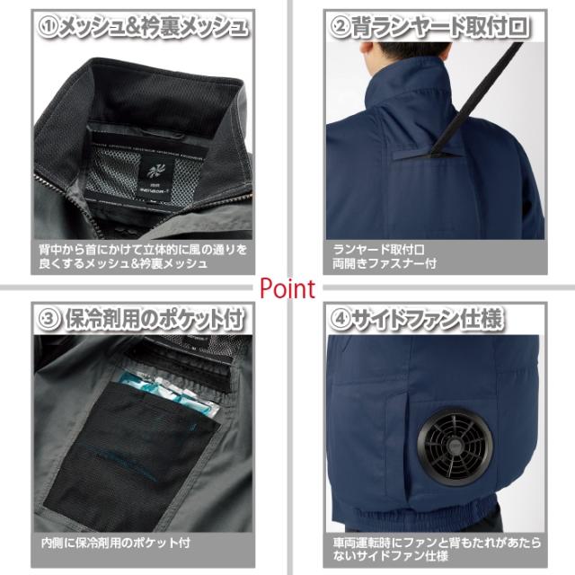 ◇機能:首回りを広くすることでジップアップしても風抜けが抜群に・首元に風を誘導するために背に通気空間をつくり風を誘導し涼しさがアップ・背中から首にかけて立体的に風の通りを良くするメッシュ・衿裏メッシュ・ランヤード掛け・背ランヤード取付口両開きファスナー付・内側に保冷剤用のポケット付・脇ポケットにバッテリーコードホール採用