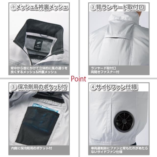 ◇機能:首回りを広くすることでジップアップしても風抜けが抜群に・首元に風を誘導するために背に通気空間をつくり風を誘導し涼しさがアップ・背中から首にかけて立体的に風の通りを良くするメッシュ・衿裏メッシュ・ランヤード掛け・背ランヤード取付口両開きファスナー付・内側に保冷剤用のポケット付・脇ポケットにバッテリーコードホール採用・袖口はストレッチバインダーテープ使用